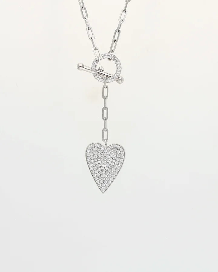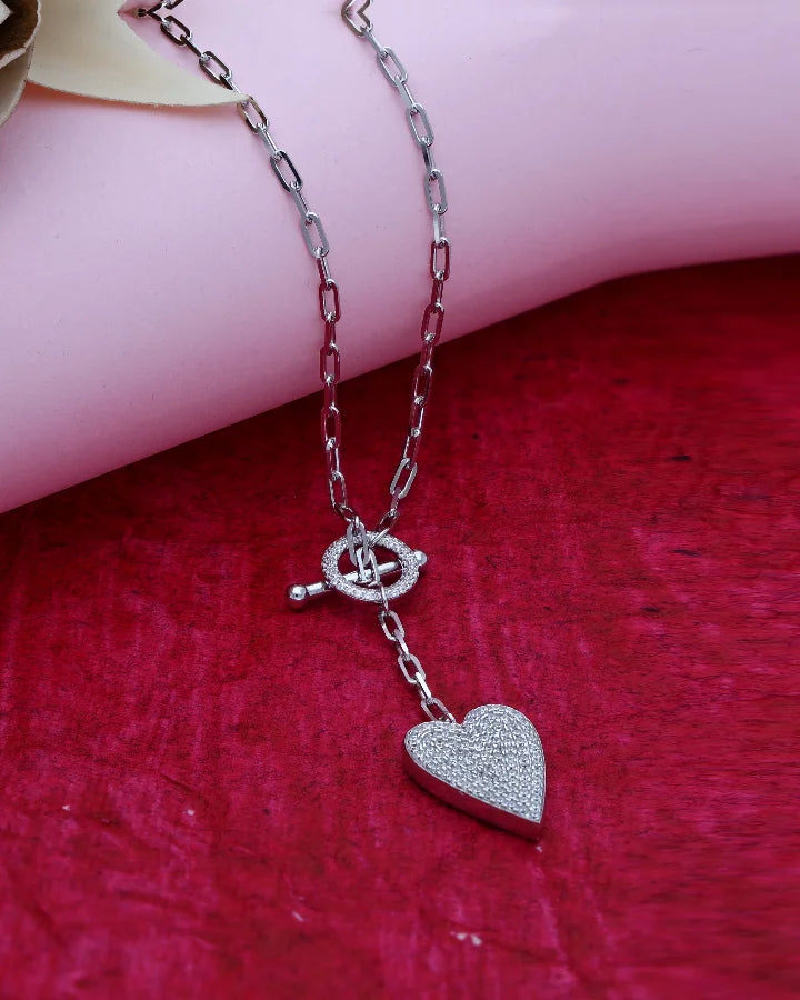 The Amora Dual Drop Link Chain in 92.5% Silver presents a polished rhodium-finished link chain with heart and circle hanging pendants embedded with white stones. Crafted from 92.5% sterling silver, it creates gentle movement and layered charm for a romantic yet contemporary look.