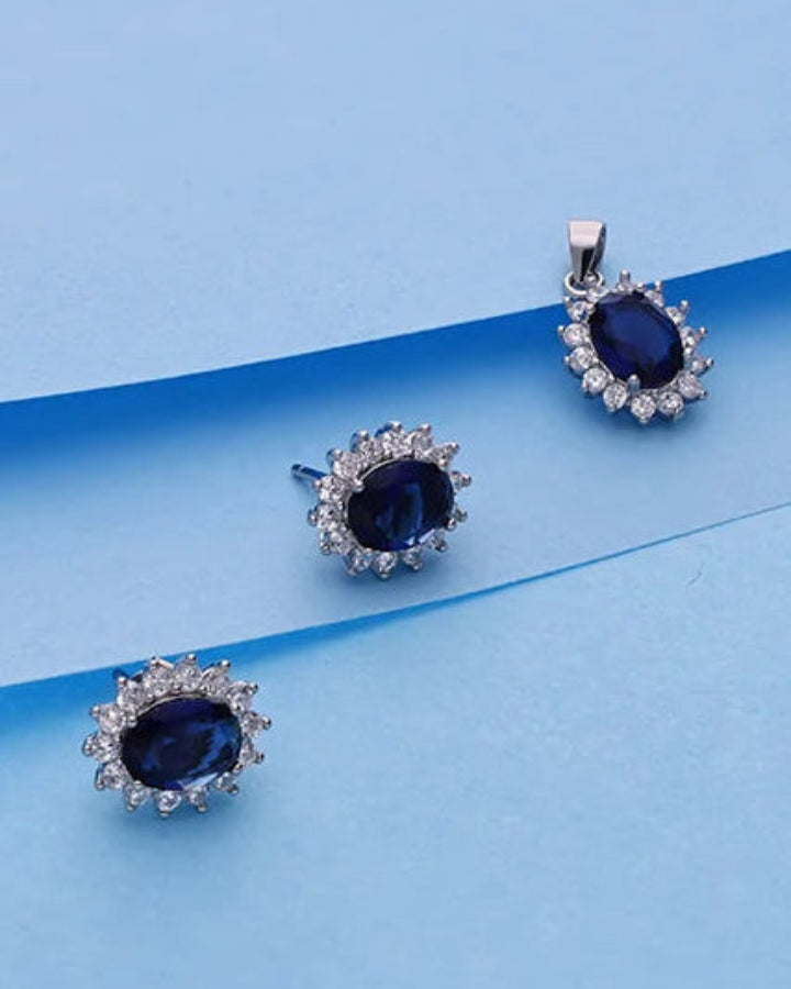 Blue Mirage Pendant Set brings forth an aura of serenity and luxury. The oval-shaped pendant, centred with a vivid blue stone, is encircled by sparkling white zircons that amplify its allure. The blue hue evokes the calmness of deep waters and the mystery of twilight skies, while the rhodium polish enhances its mirror-like sheen. Paired with coordinating earrings, this pendant set is an exquisite statement for cocktail parties and night celebrations, evoking a sense of cool glamour and quiet confidence.