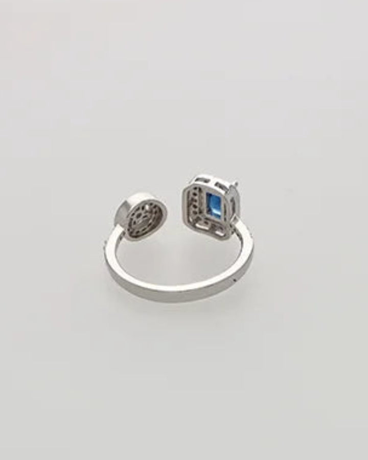 Bathed in the brilliance of rhodium plating, this handcrafted sterling silver ring is a vision of refined elegance. A captivating blue stone rests at its heart, encircled by glistening white micro stones that mirror the night sky’s quiet shimmer. Adjustable for comfort and grace, it’s a timeless piece that celebrates confidence, sophistication, and the allure of effortless beauty.
