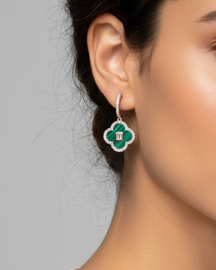 Celisse Leaf Drift Hoops are designed with a hanging leaf motif adorned with white micro stones. Crafted in rhodium-plated 92.5% sterling silver, they deliver graceful movement and refined brilliance, ideal for festive and bridal ensembles.