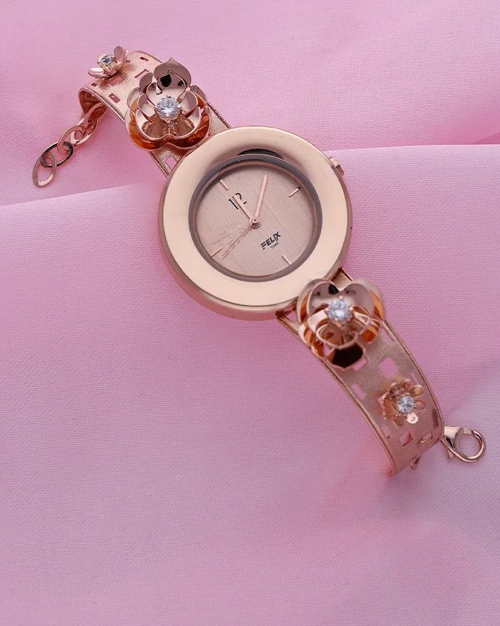 Crafted in 92.5% sterling silver with a radiant rose gold finish, it features a minimal dial beautifully paired with an intricately designed strap of floral motifs and sparkling crystal accents.Blending the charm of fine jewelry with the precision of timekeeping, this graceful piece transitions effortlessly from everyday wear to festive celebrations.