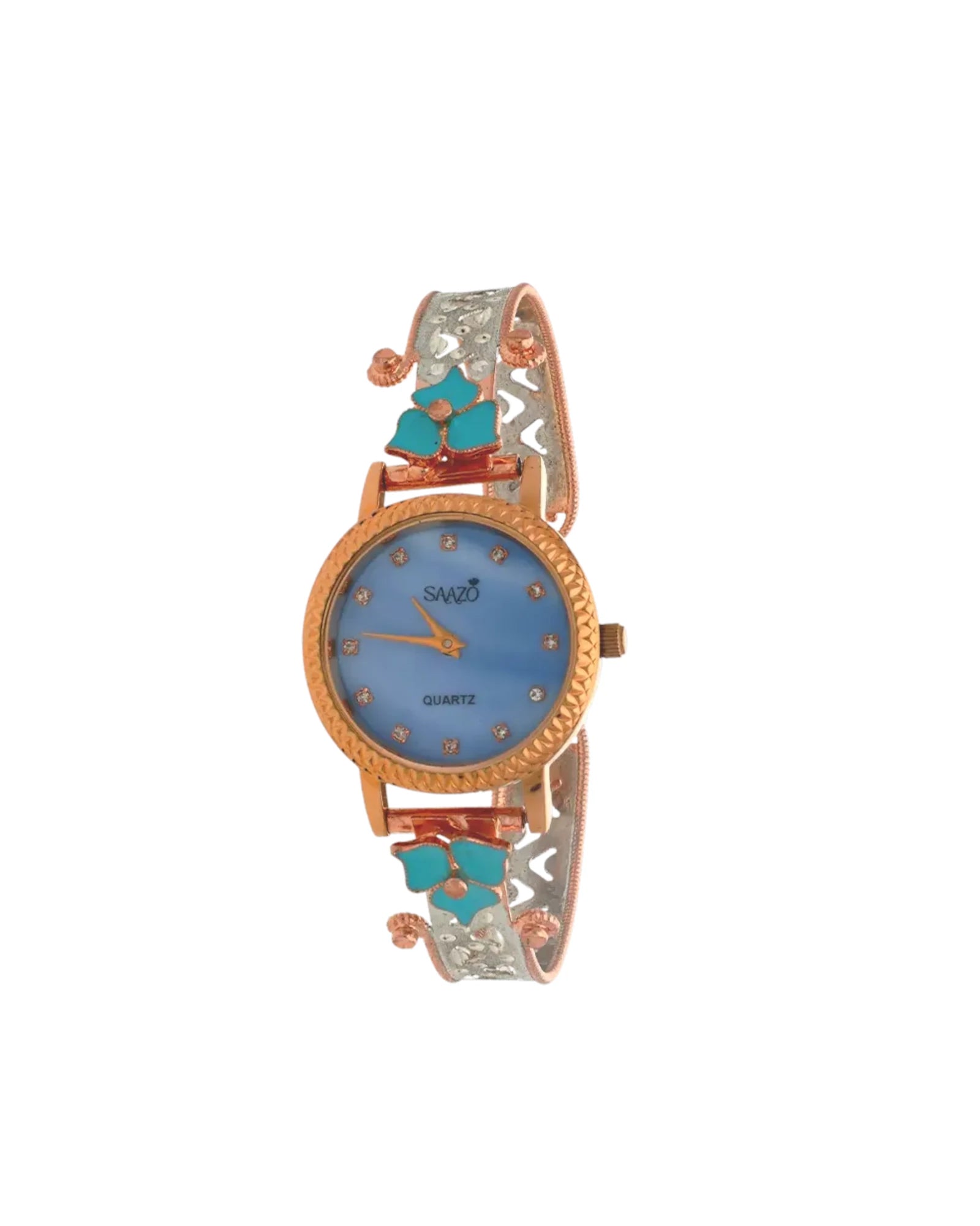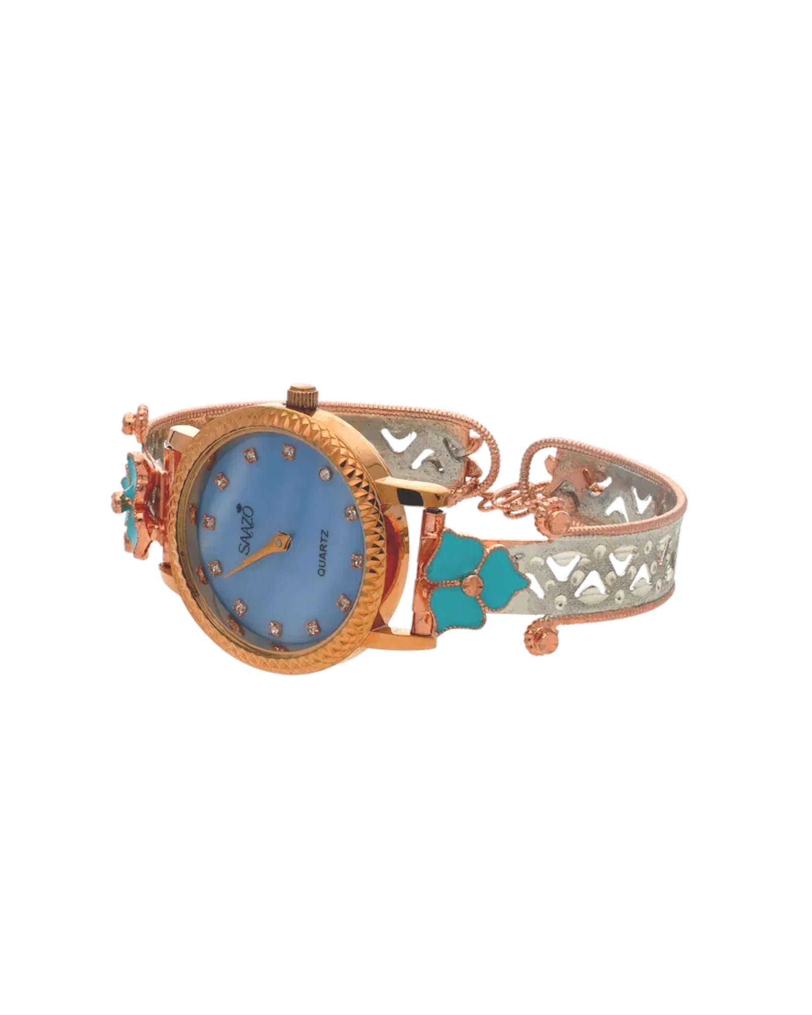 The Saazo Women's Floral Bangle Watch is an important women's accessories timepiece that will make you classier especially when it is worn as part of the Silsila Lustre Collection. A stunning light blue dial and sophisticated enamel work make this timekeeper an icon of contemporary elegance and female beauty. It contains a square artificial gemstone which shines bright and made of 92.5% pure silver and coated with an attractive tone of roses. It is termed as an exclusive watch because it can be worn on special events such as proms, official duties among others; but when you wear it, you will realize that it is more than a time keeper – it is pure elegance. Take heed and remember those special times forever; it is a present.