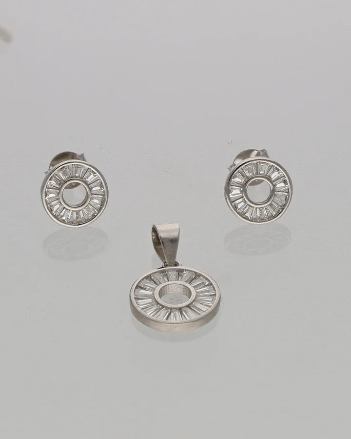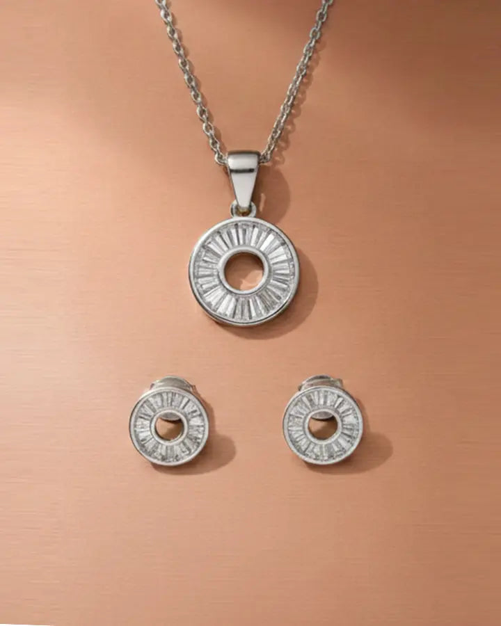 Featuring a delicate arrangement of ice themed stones, this rhodium pendant set is enhanced by a glowing centre design. The refined structure adds elegance without heaviness, while the matching earrings provide a complete coordinated look. Perfect for celebrations, parties, and graceful everyday styling.