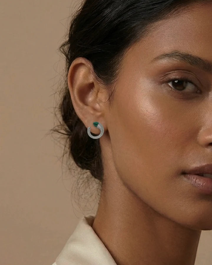 Lunara Moon Spark Studs showcase crescent moon shapes enriched with woody enamel and micro stone detailing. Made in 92.5% sterling silver, they offer subtle sparkle and symbolic elegance.