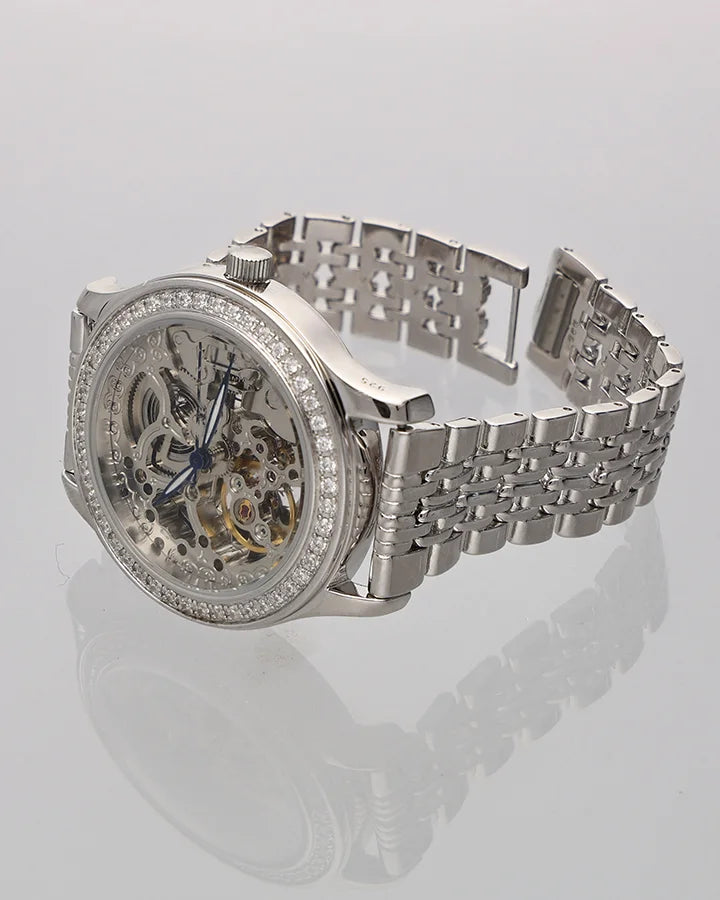 The open skeleton dial unveils the intricate dance of mechanics—where tradition meets contemporary design. Embellished with sparkling cubic zirconia, it brings a refined touch of glamour and sophistication. Whether for the boardroom, a grand celebration, or everyday refinement, this masterpiece is more than a watch—it is an expression of enduring luxury.