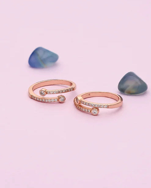 The Serenora Toe Rings showcases an elegant rose-gold design with circular white stones placed intricately on both sides. Fashioned in 92.5% sterling silver, it blends symmetry with subtle radiance. The adjustable fit makes it suitable for daily wear or festive dressing, adding a refined, balanced sparkle.