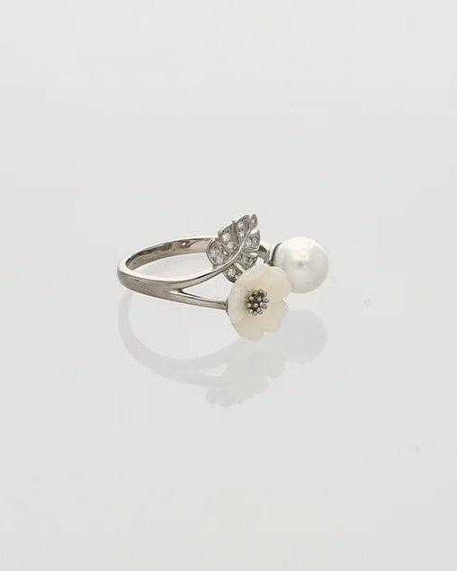 The Sylva Pearl Floral Leaf Ring in 92.5 Silver combines floral detailing with leaf-inspired embellishments, framing a luminous pearl centerpiece. Crafted from rhodium-plated sterling silver, this adjustable ring reflects refined craftsmanship and graceful sophistication.