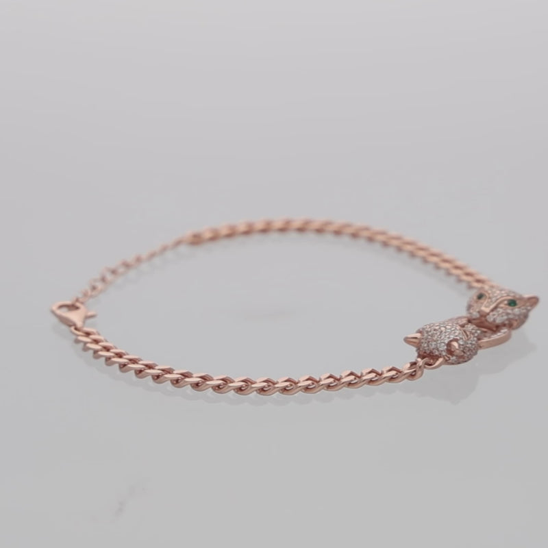 Twin Fang Rose light Cuban Bracelet: A captivating rose gold Cuban bracelet showcasing twin-tiger motifs adorned with white micro stones. Its warm metallic glow paired with bold animal symbolism creates a luxurious balance of elegance and strength, adding a unique edge to contemporary jewellery collections.